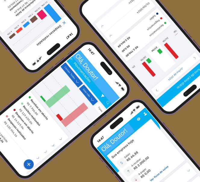 Tenha visão diária de contas a pagar, a receber, fluxo de caixa e previsões de resultado. Tudo isso categorizado, na palma da mão.